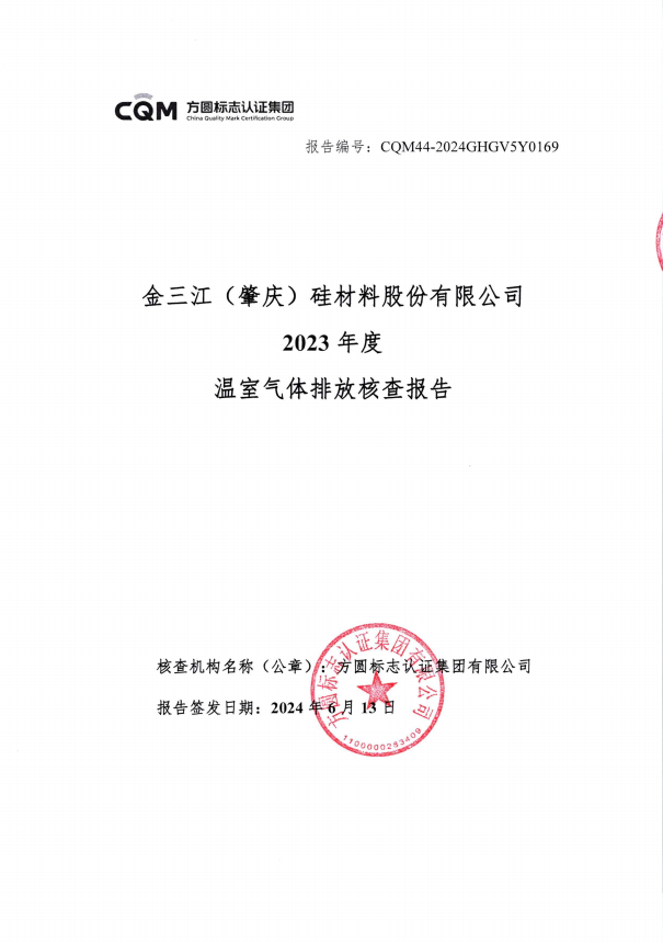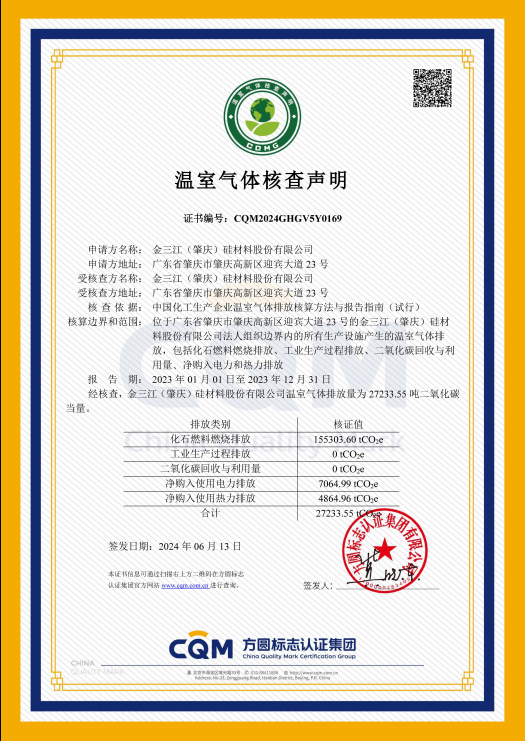 In order to effectively understand and manage the current status of greenhouse gas emissions, Jinsanjiang (Zhaoqing) Silicon Material Co., Ltd. has carried out a verification of greenhouse gas emissions. Based on the results of the verification, the company will further promote plans related to the reduction of greenhouse gas emissions. The “Greenhouse Gas Verification Statement,” “Greenhouse Gas Emission Verification Report,” “Product Carbon Footprint Evaluation Report Verification Statement,” and “Product Carbon Footprint Report” are hereby announced to the public.